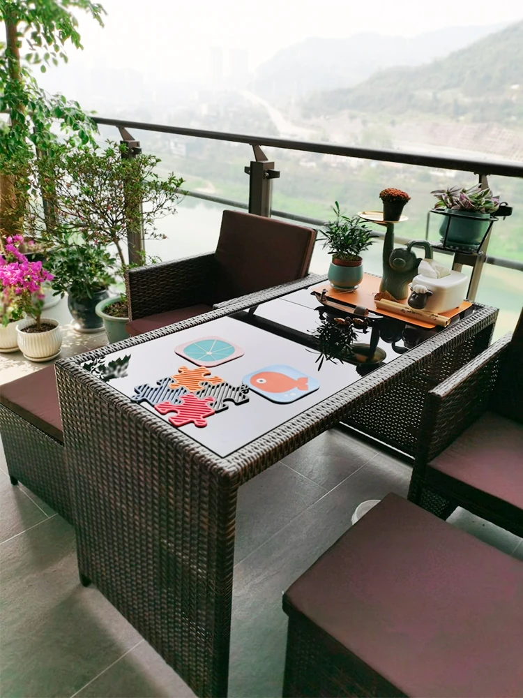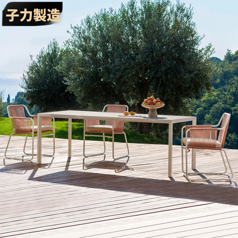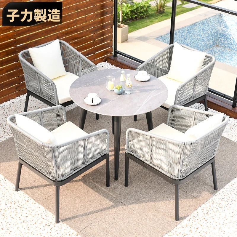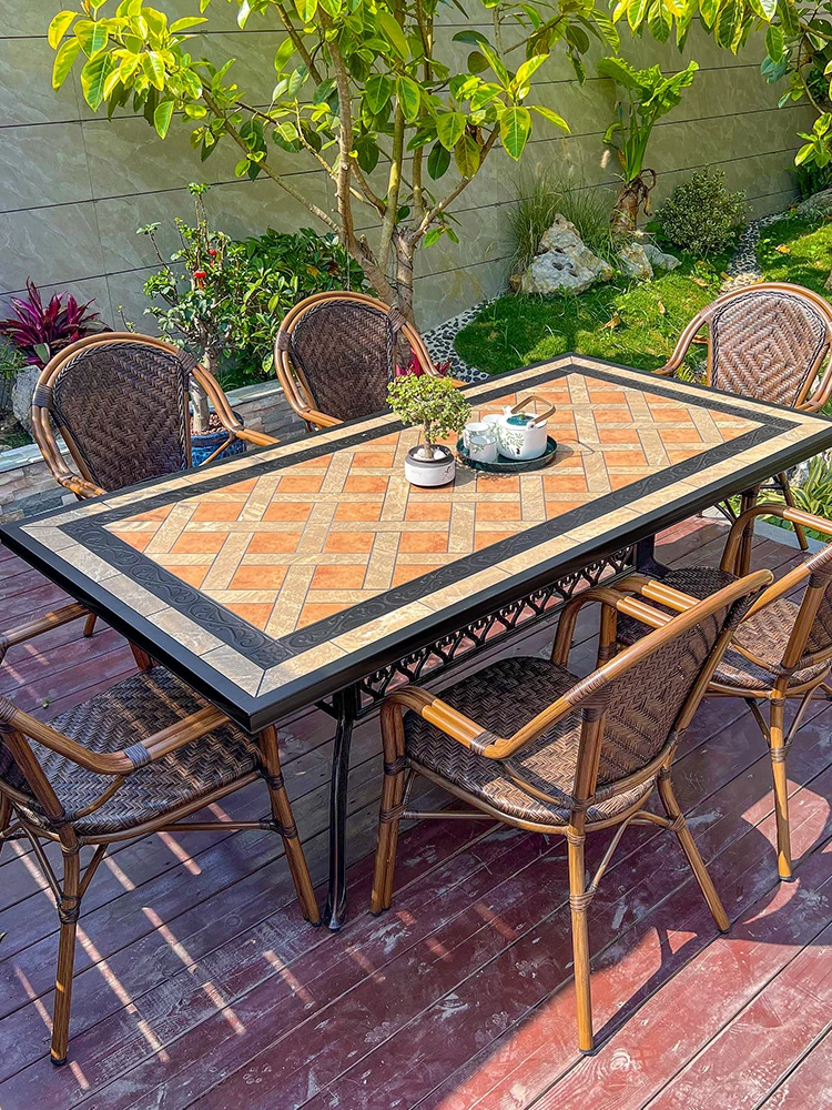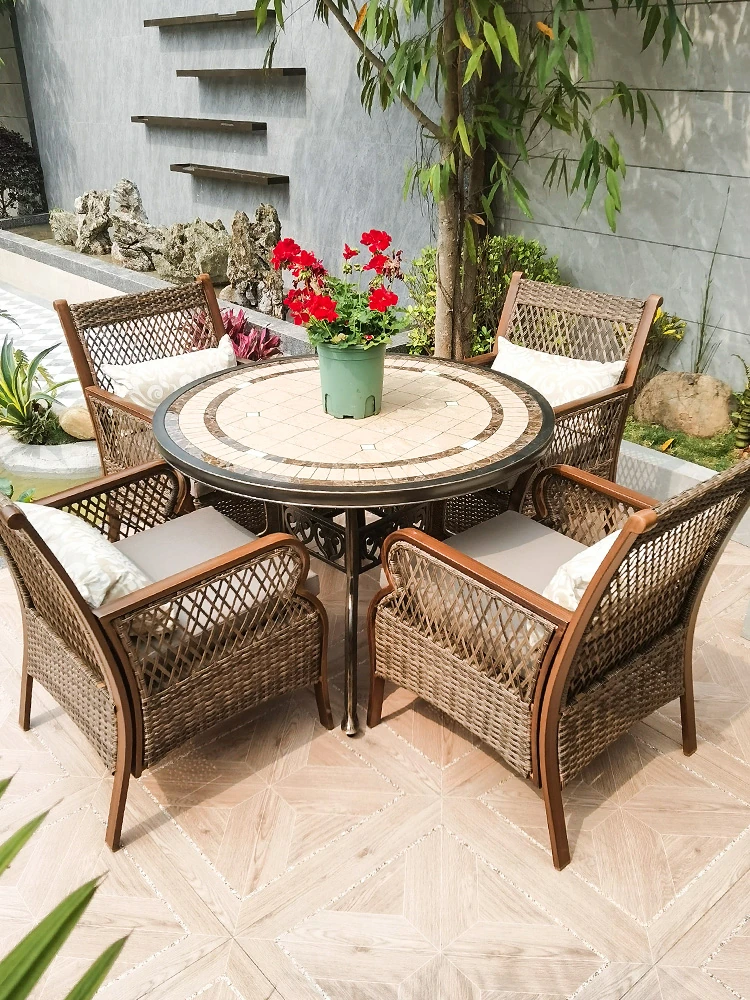 子力アウトドアテーブル&チェアセット - 北欧スタイルの高級庭園用タイルテーブル、バルコニーに最適なラタンチェア、家庭用ガーデンにもぴったり!快適なひとときをお楽しみください。