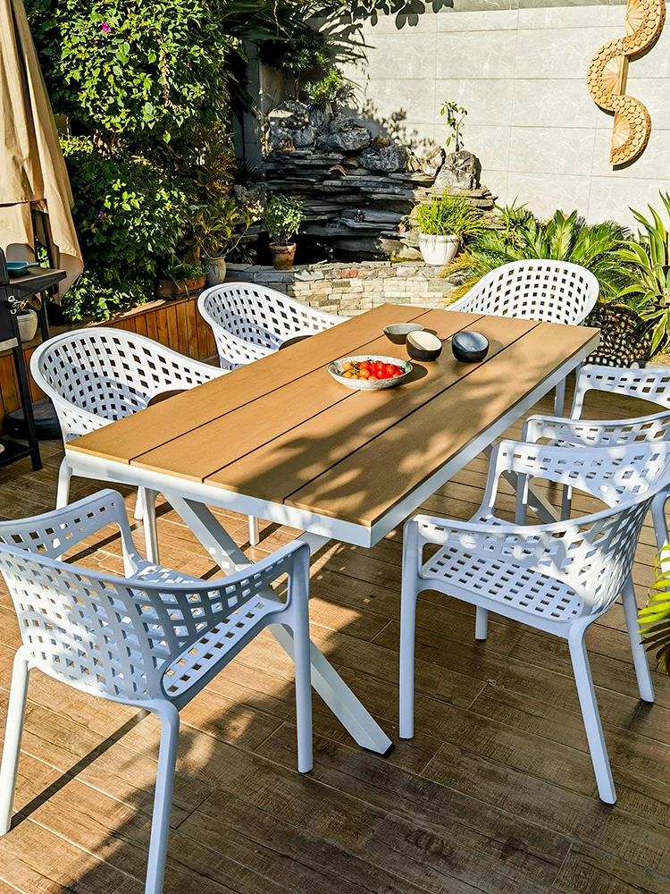 アウトドアパティオテーブル&チェアセット|防水・UVカット・耐腐食の木製プラスチックコンビネーション|おしゃれなガーデンリビングに最適!ヴィラや庭にぴったりな屋外用ダイニングテーブル。