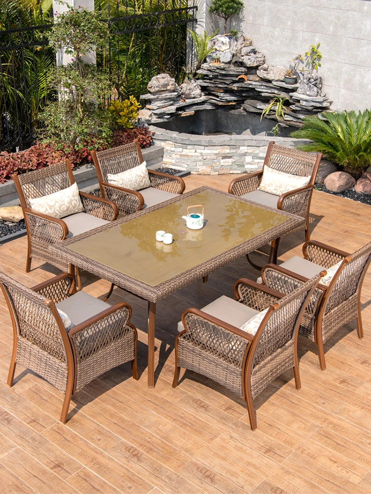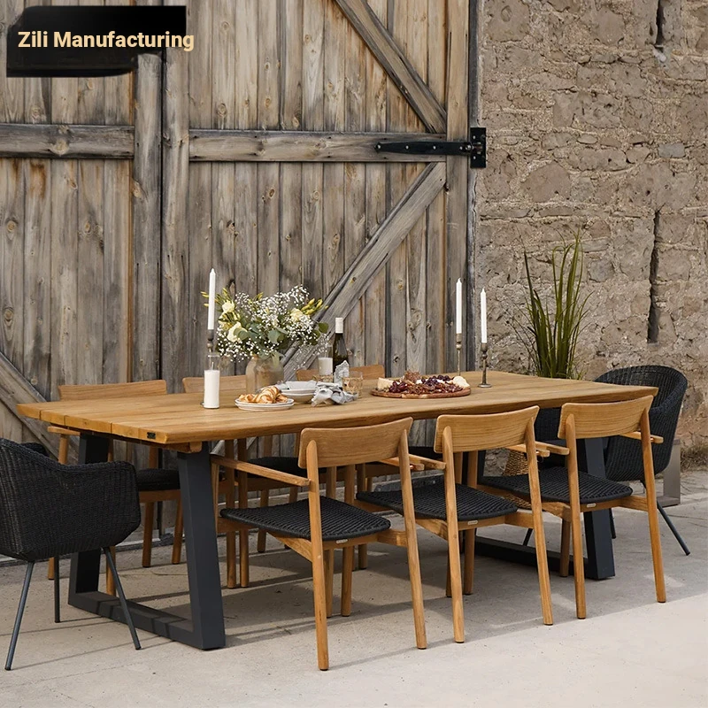 Zili Teak Outdoor Rattan Dining Set - Stylish and Durable Garden Furniture for Villas, Hotels, and Courtyards - Weather-Resistant Wooden Table and Benches - Perfect for Outdoor Entertaining