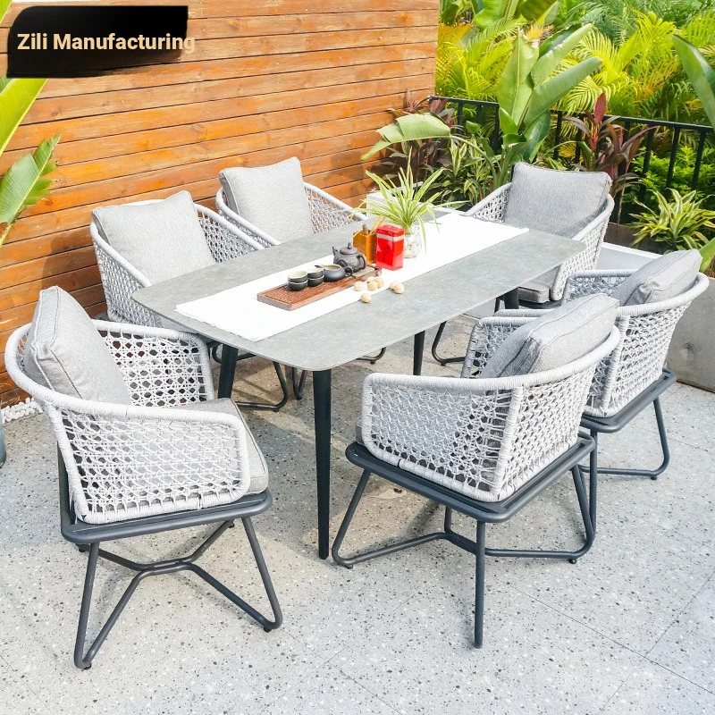 "Zili Outdoor Dining Set - Nordic Style Garden Patio Rock Slab Table with Relaxing Pull Rope Chairs for a Cozy Outdoor Experience"