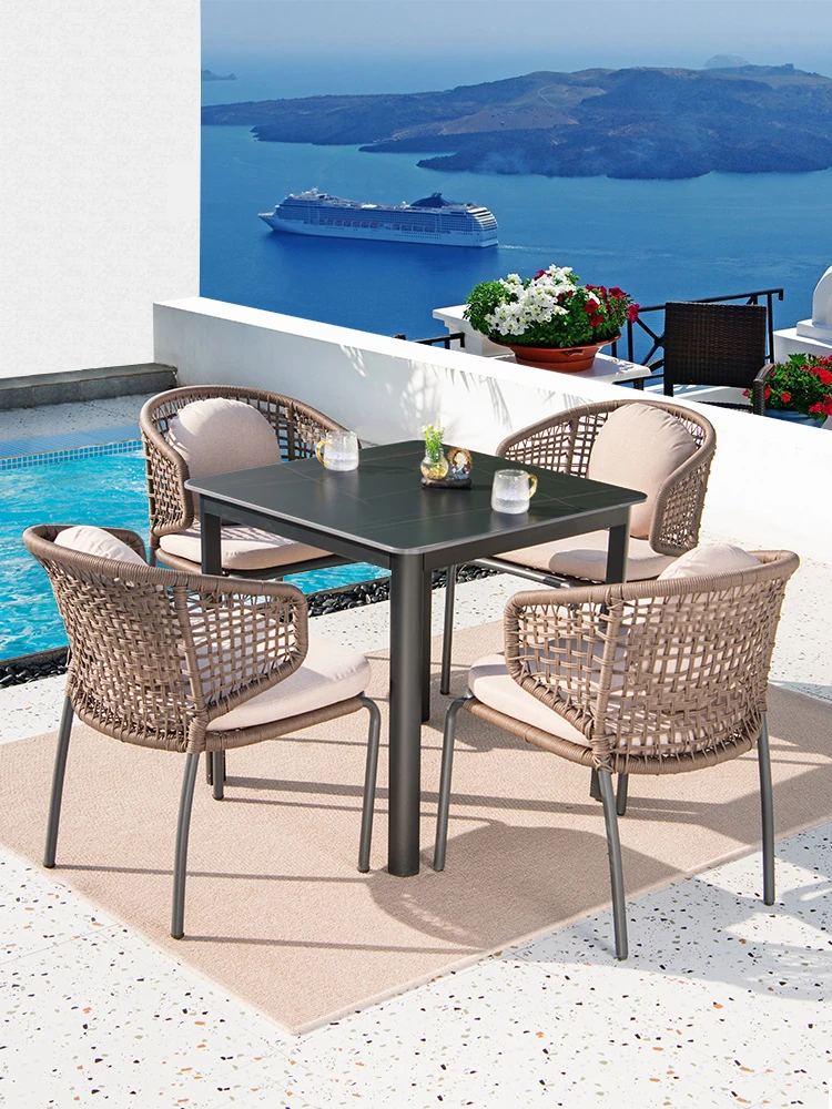Nordic Style Dining Set with Marble Table - Modern Minimalist Outdoor Patio Rattan Chairs for Garden and Balcony