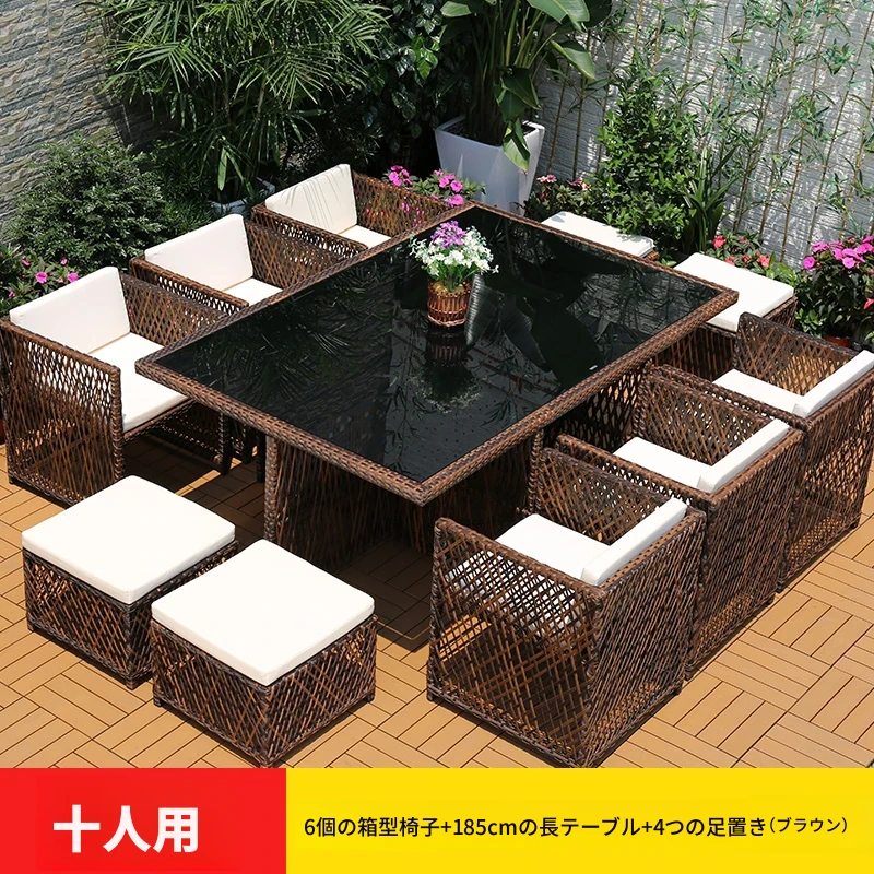 10人用:6脚ボックスチェア + 185cm長テーブル + 4フットスツール(ブラウン)