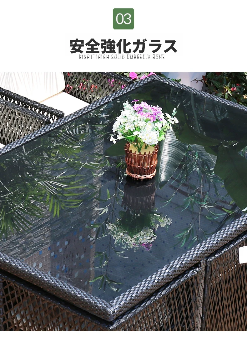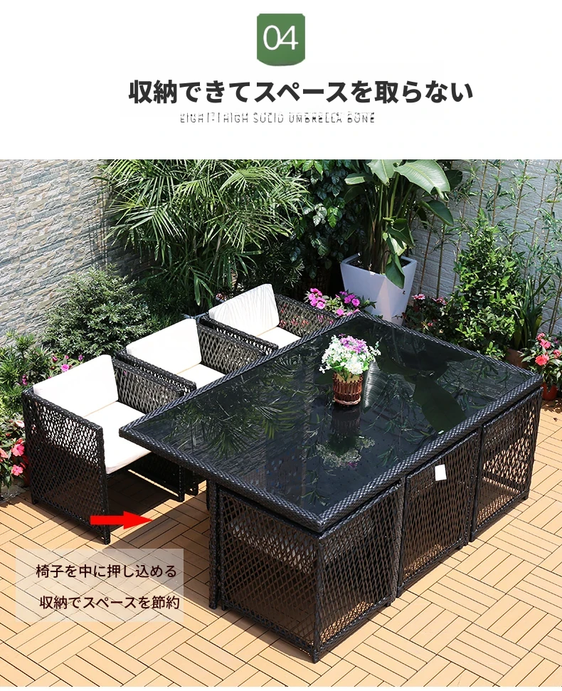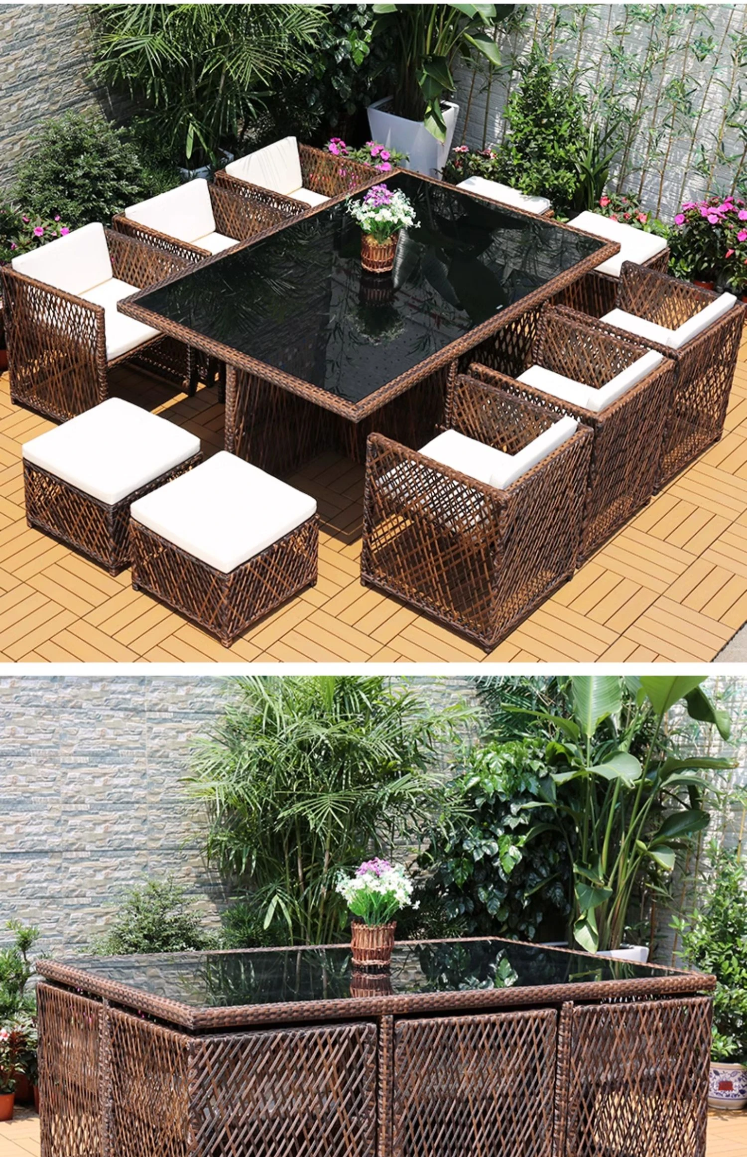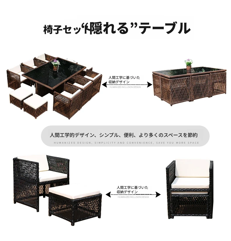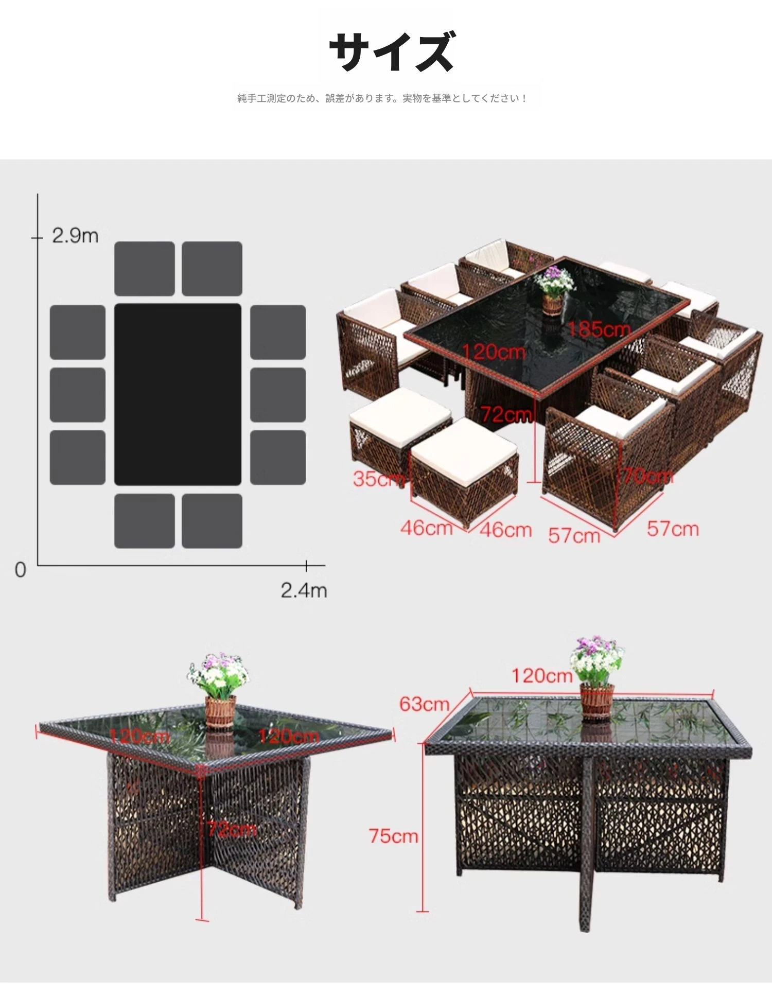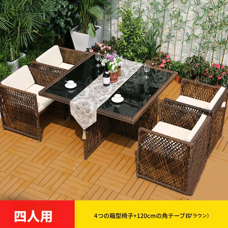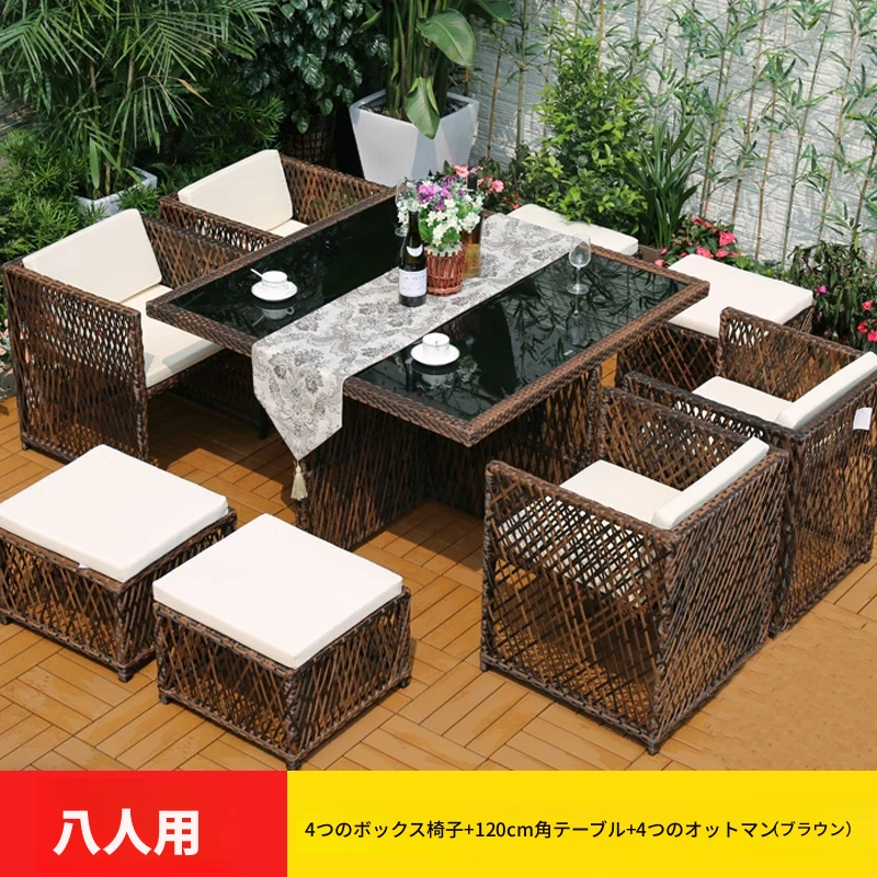 8人用:4つのボックスチェア + 120cm正方テーブル + 4つのオットマン(ブラウン)