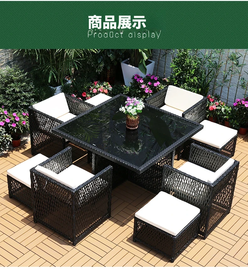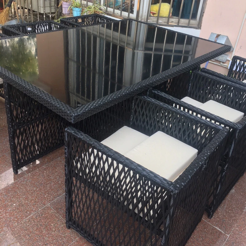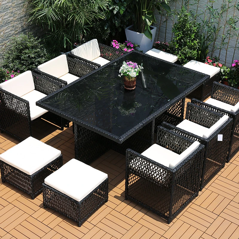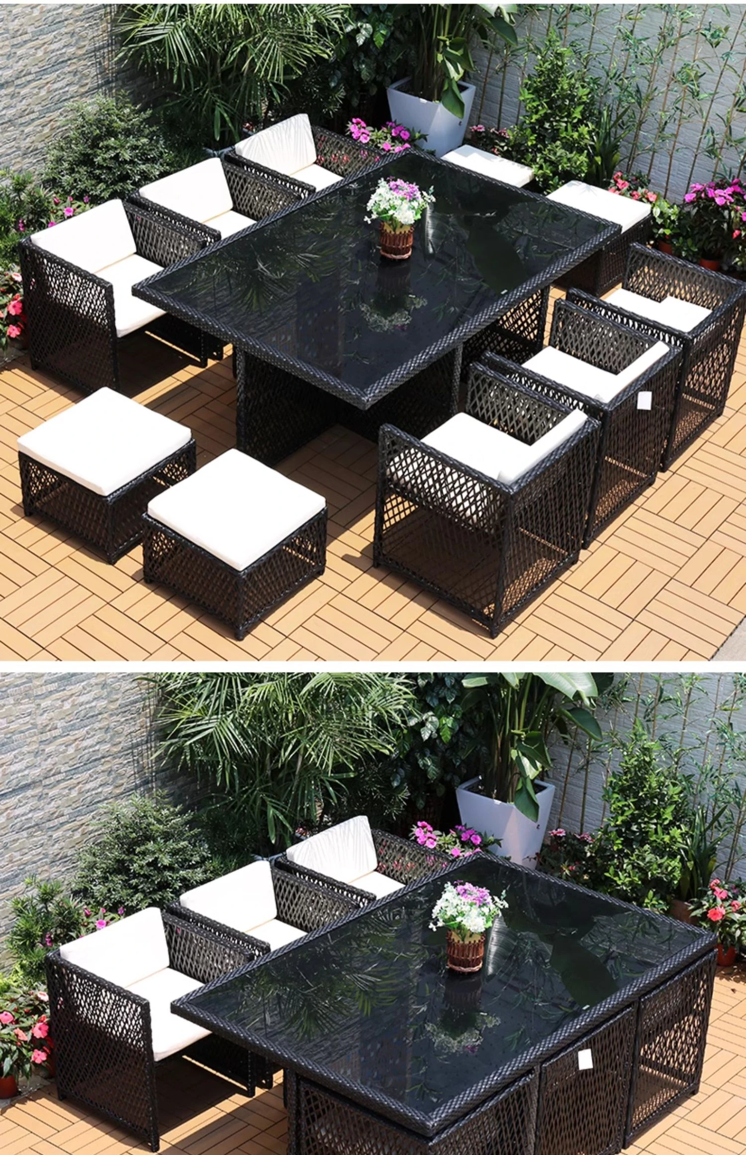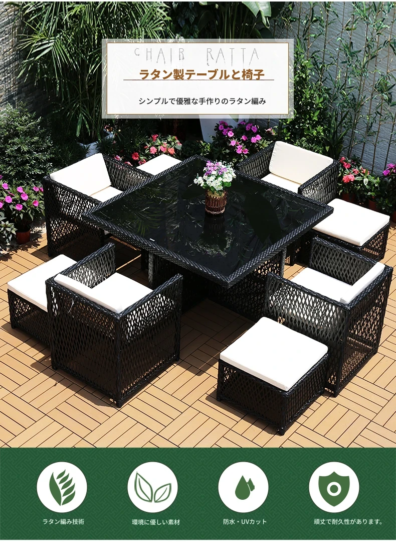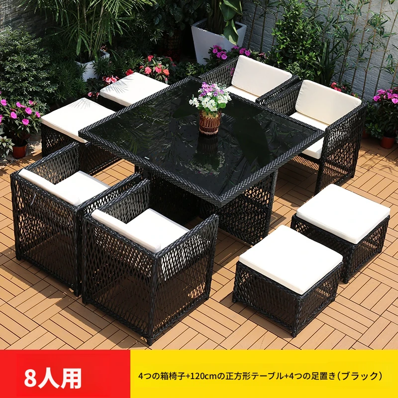 8人用:4つのボックスチェア + 120cmの正方形テーブル + 4つのフットスツール(黒)