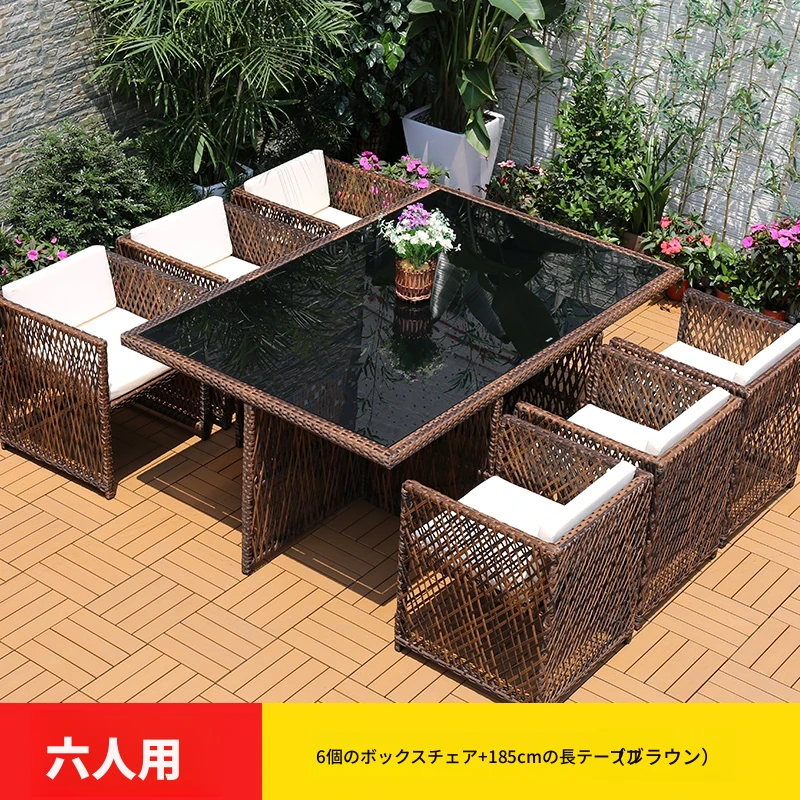 6人用:6個のボックスチェア+185cmの長テーブル(ブラウン)