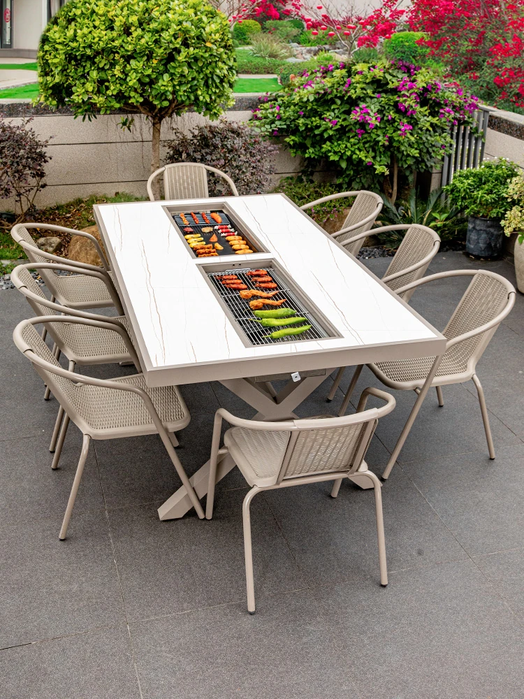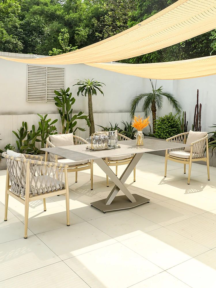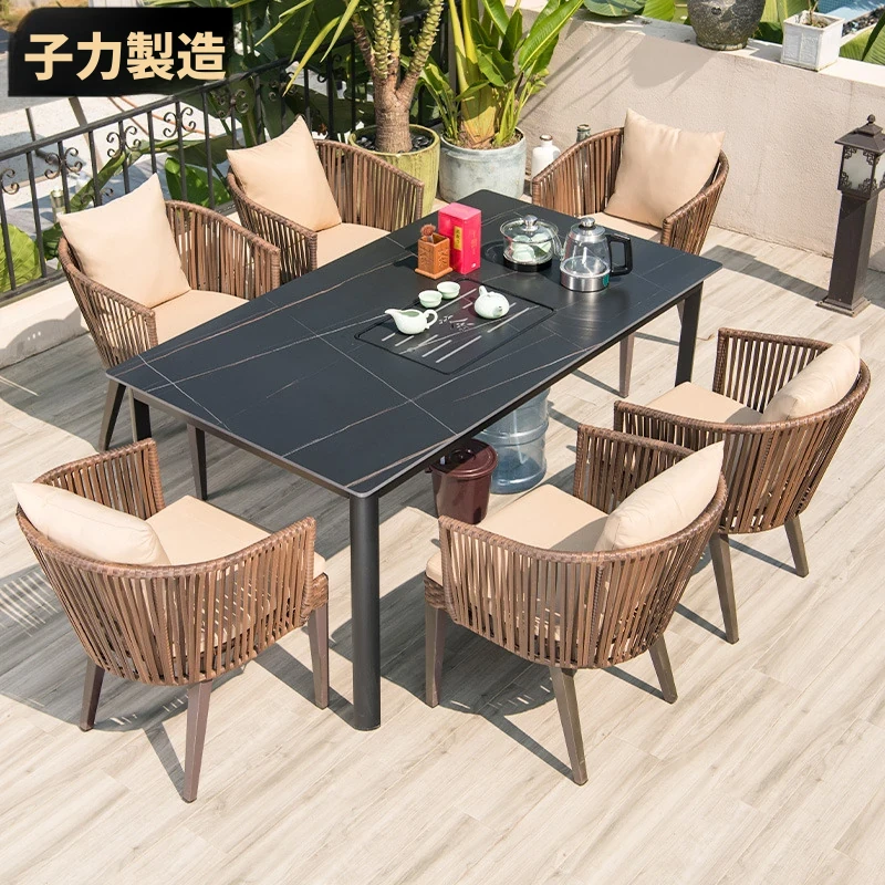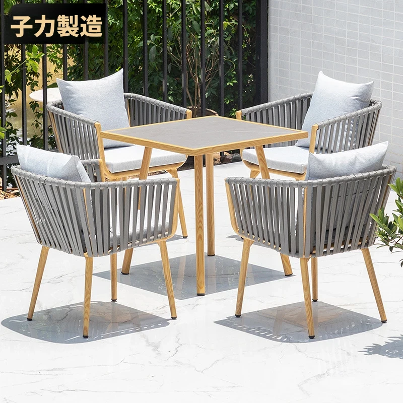 子力アウトドアテーブル&チェアセット - 北欧スタイルの高級庭園用タイルテーブル、バルコニーに最適なラタンチェア、家庭用ガーデンにもぴったり!快適なひとときをお楽しみください。