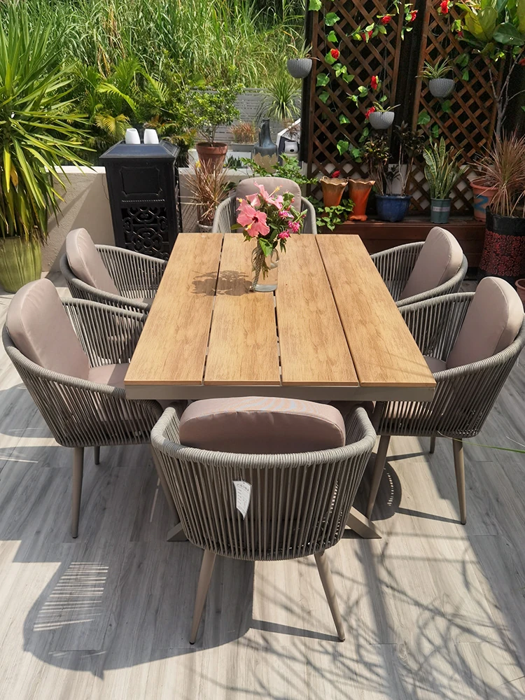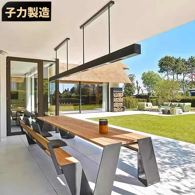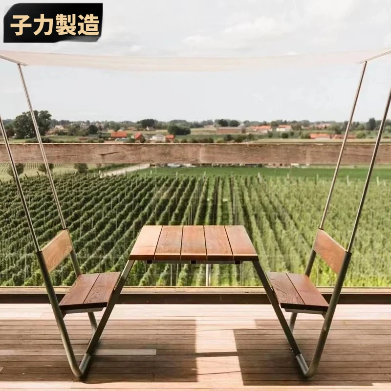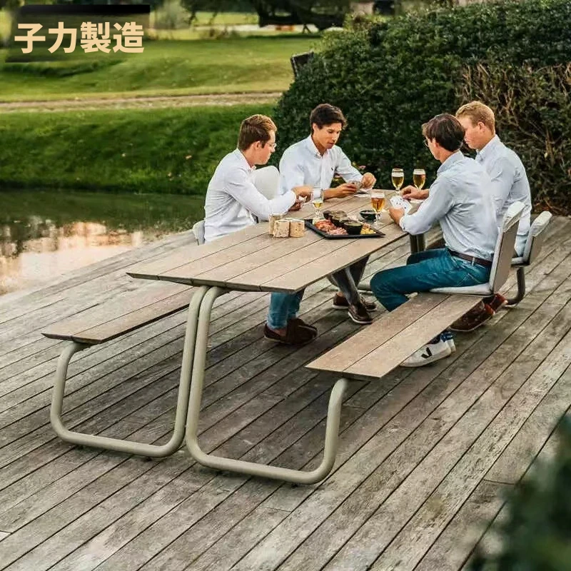 子力公園のアウトドアチェア&テーブルセット - 防腐木材とアルミ合金製の長椅子で、公共スペースやリゾートに最適!快適な座り心地と耐久性を兼ね備えた、あなたの庭や公園にぴったりのアイテムです。