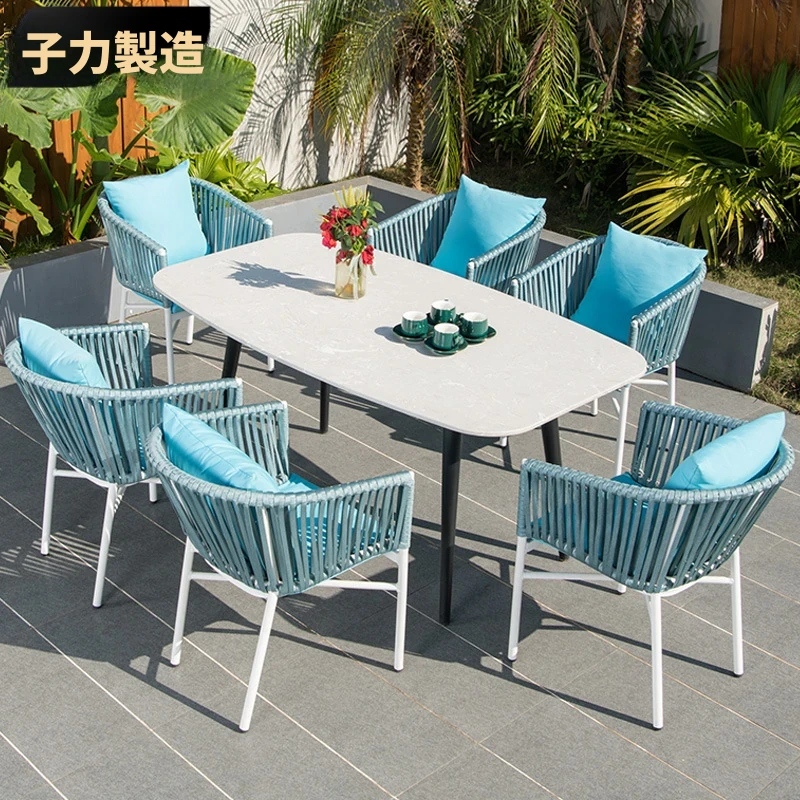 子力アウトドアパティオテーブル&チェアセット - おしゃれな青いラタン編みのデザインで、庭やテラスを彩る!リラックスしたひとときを楽しむための理想的な組み合わせ。