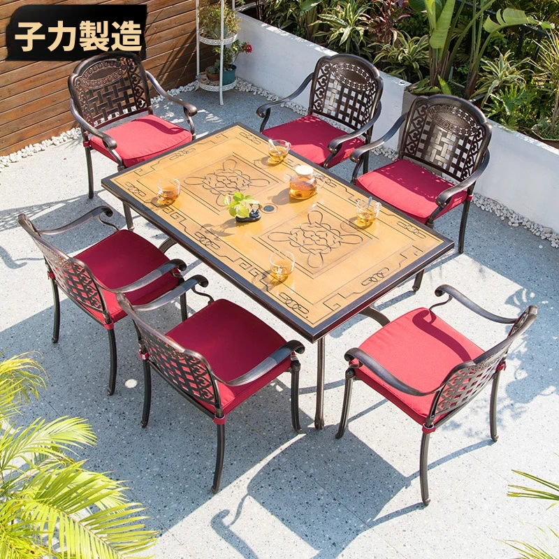 子力アウトドアテーブル&チェアセット - アルミニウム鋳造とタイルデザインで、庭やバルコニーにぴったり!おしゃれなアイアン製のリラックスチェアで、快適なひとときをお楽しみください。