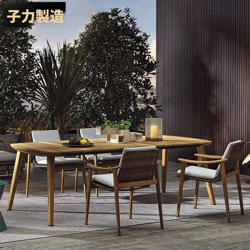 子力北欧スタイルのアウトドアテーブル&チェアセット - おしゃれな庭やテラスにぴったり!リゾート感あふれるラタンと実木のコンビネーションで、快適なひとときをお届けします。ヴィラやモデルハウスにも最適な家具!