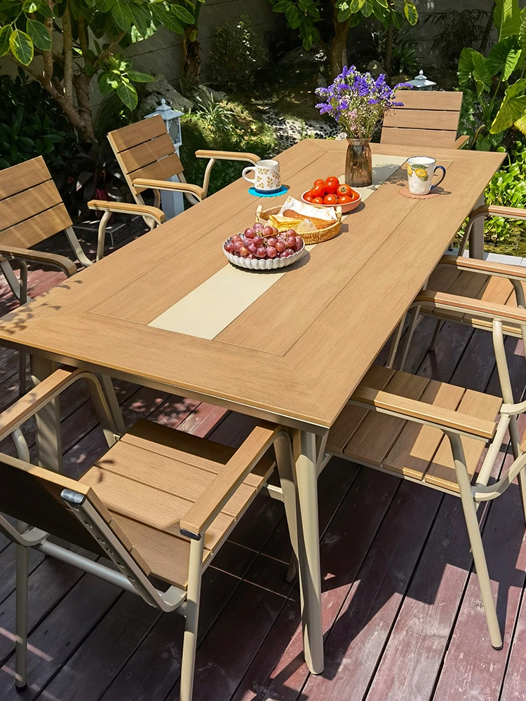 子力アウトドアレジャーテーブル&チェアセット - 庭や別荘、ガーデンに最適!北欧風のプラスチック木材デザインで、スタイリッシュで耐久性抜群。快適な屋外空間を演出する、理想的な組み合わせです!